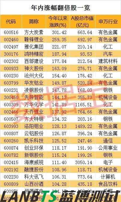 數(shù)據(jù)寶統(tǒng)計(jì)顯示,剔除近一年上市的次新股,25只個(gè)股年內(nèi)漲幅在100%以上。值得注意的是,7只個(gè)股來自鋰電池板塊,分別是方大炭素(600516)、贛鋒鋰業(yè)(002460)、雅化集團(tuán)、華友鈷業(yè)(603799)、先導(dǎo)智能(300450)、天齊鋰業(yè)(002466)、融捷股份(002192)。